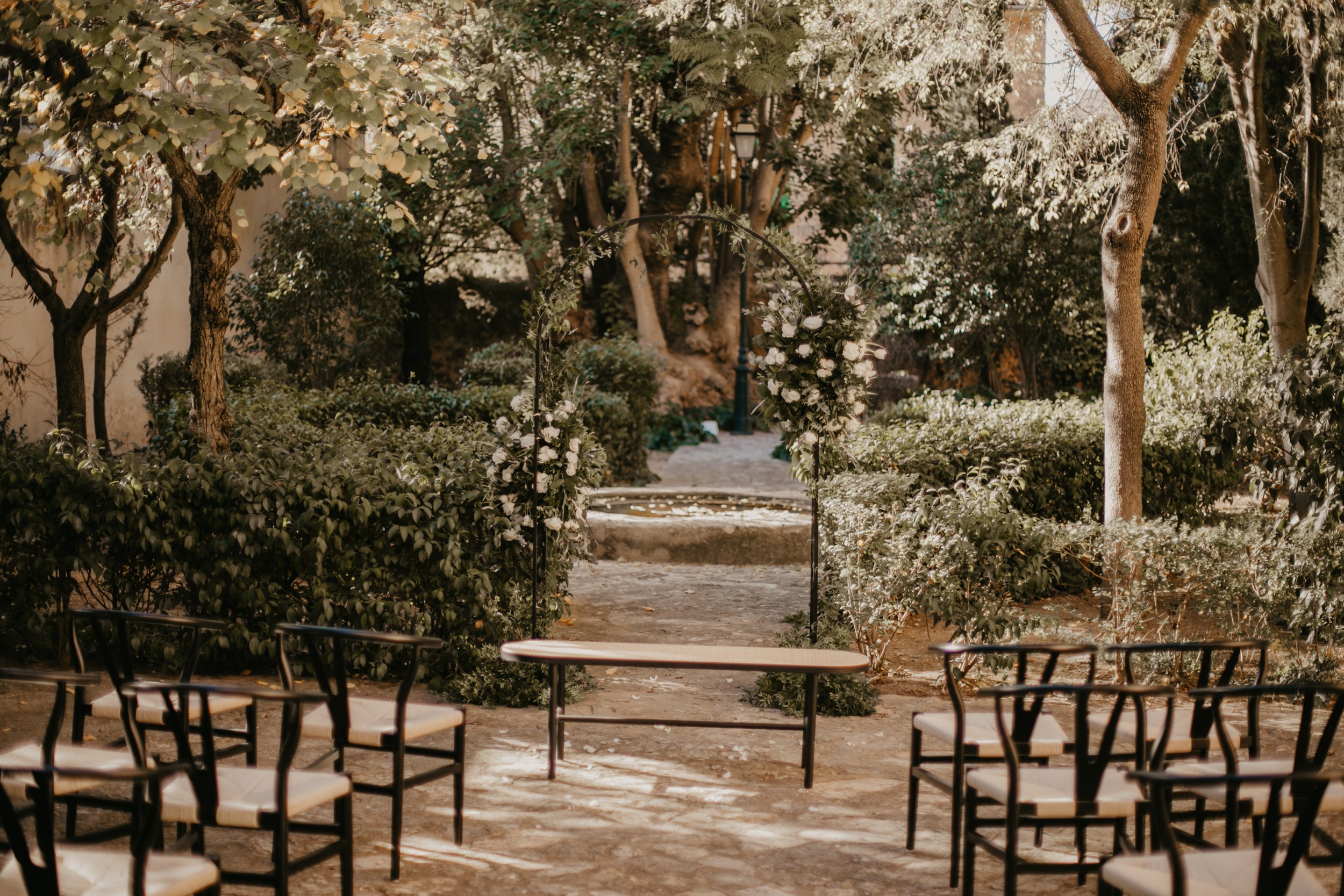 Spaces: ceremony garden, courtyard cocktail area, outdoor dinner terrace, indoor hall